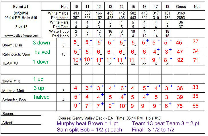 Team #13 (Bob/Matt) won the team match 4-3, or 1up, and get 2 points.